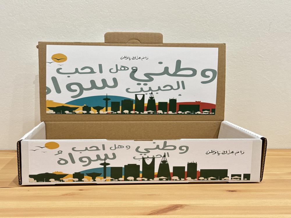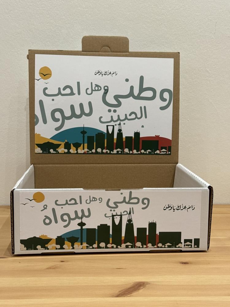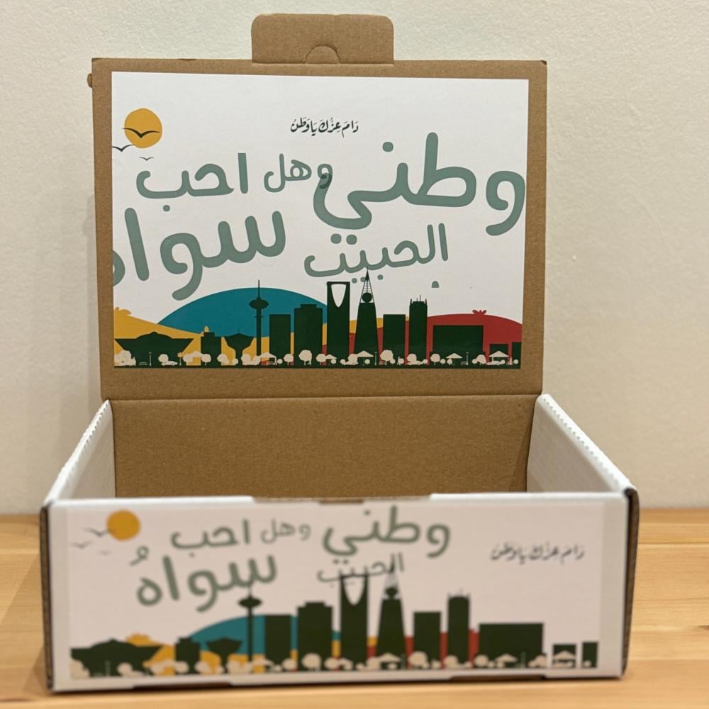 احتفل باليوم الوطني السعودي بطريقة مميزة مع علبة توزيعات أنيقة مطبوعة بتصميم وطني يحمل عبارة “وطني وهل أحب سواه”.