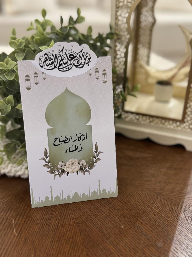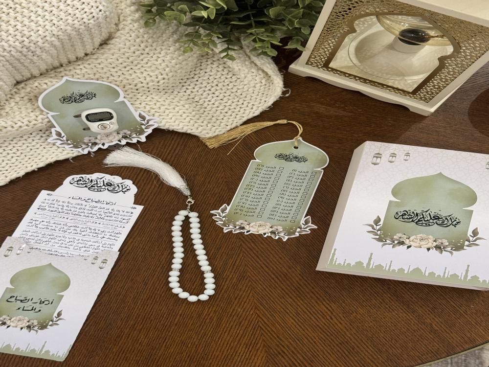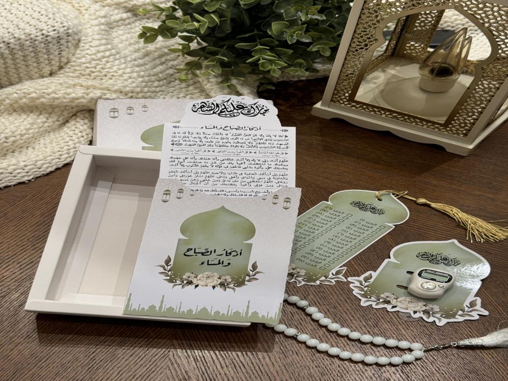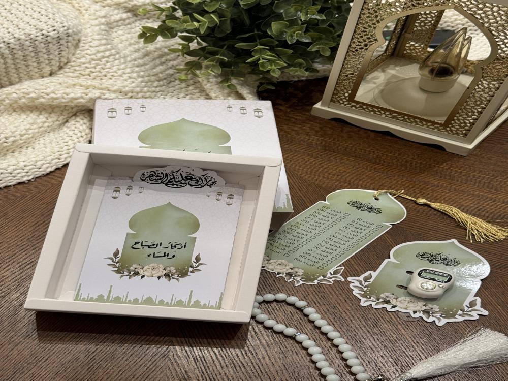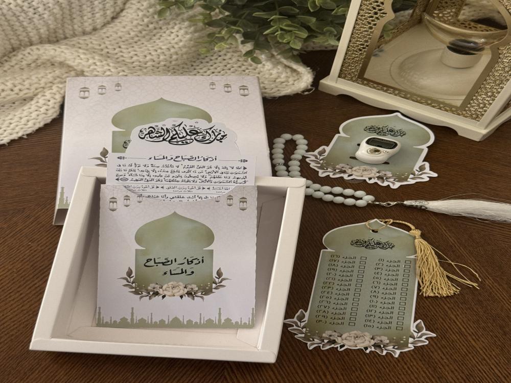 • يحتوي البوكس على ( خاتم تسبيح ، كرت اذكار الصباح والمساء ، فاصل قران ، مسبحة )