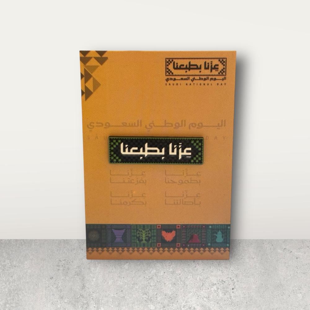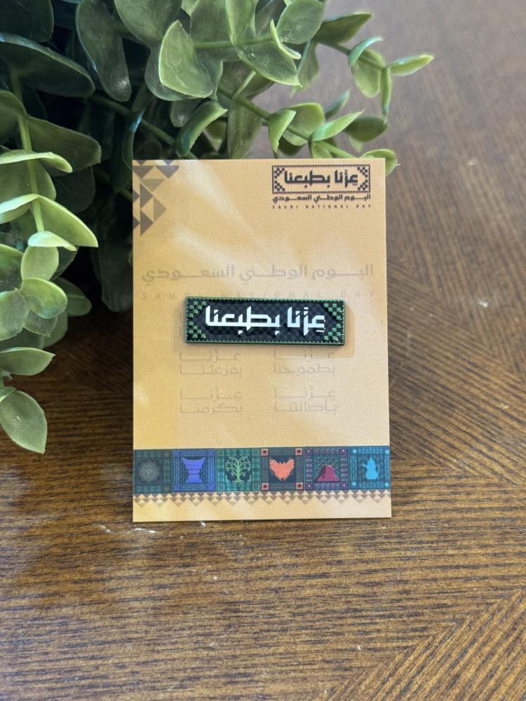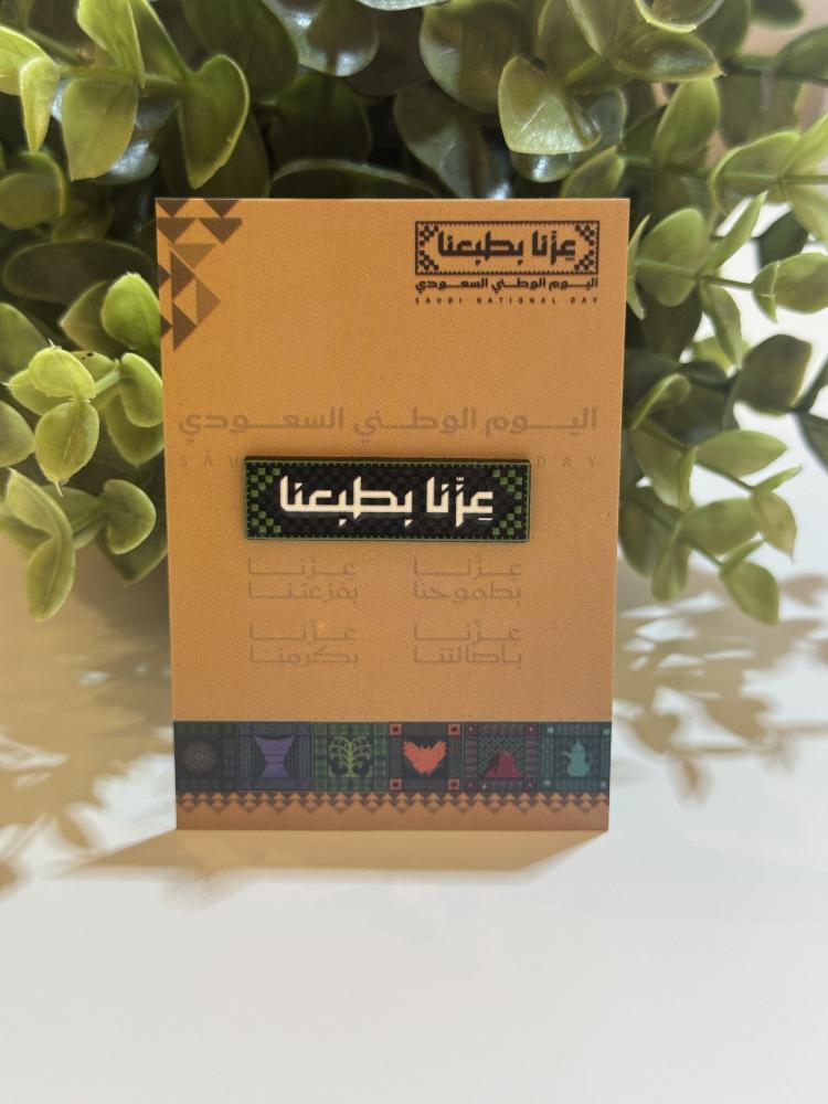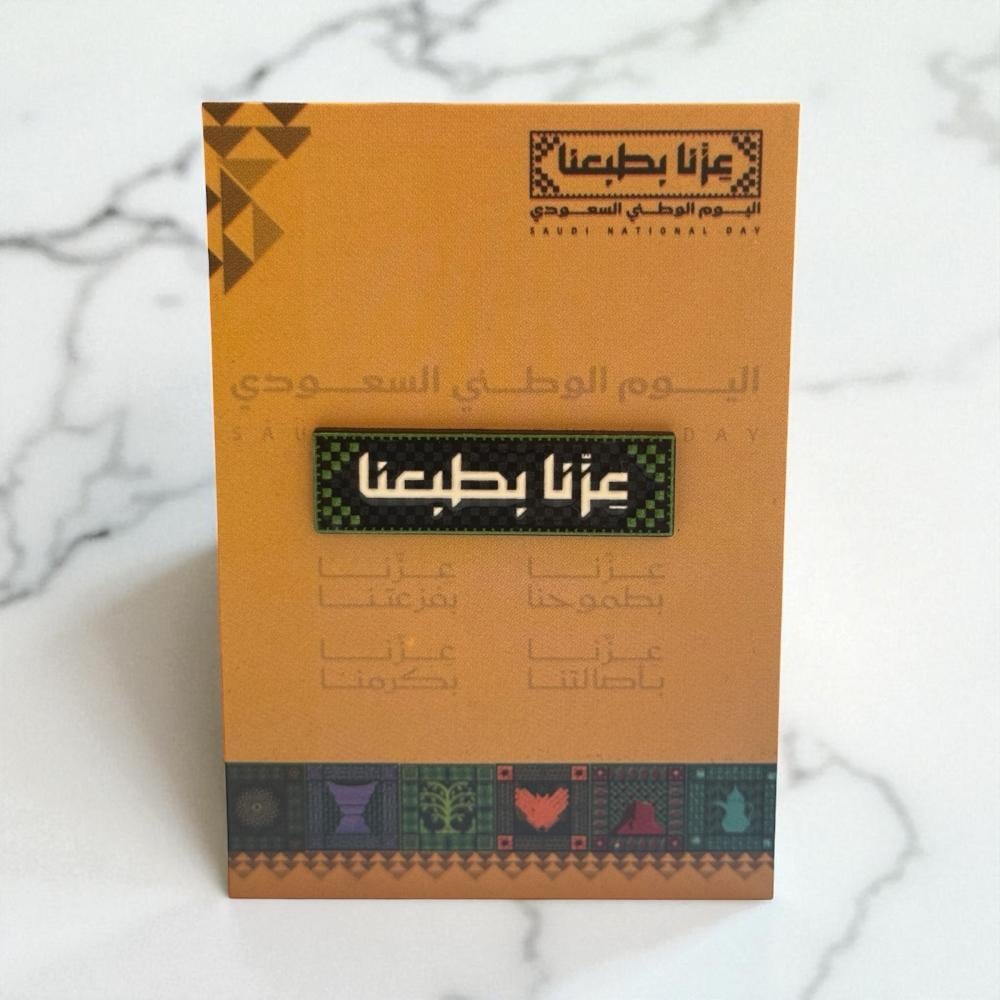 - بروش معدني فاخر بشعار اليوم الوطني “عزنا بطبعنا” مصنوع من الحديد بجودة عالية، يضفي لمسة فاخرة على ملابسك أو حقائبك.