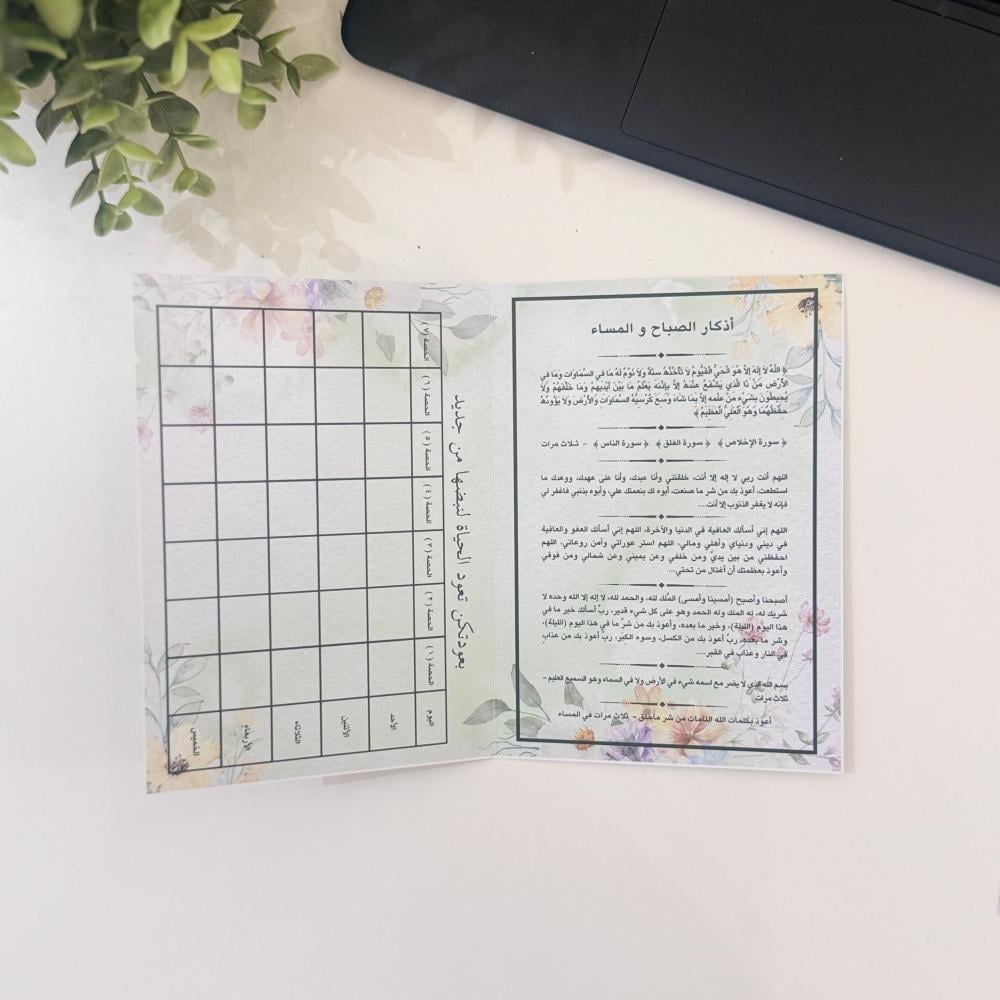 جدول أنيق مميز يحتوي على أذكار الصباح والمساء ليساعدك على بداية يومك بالبركة والسكينة، مع مساحة لتنظيم مهامك الأسبوعية بسهولة.