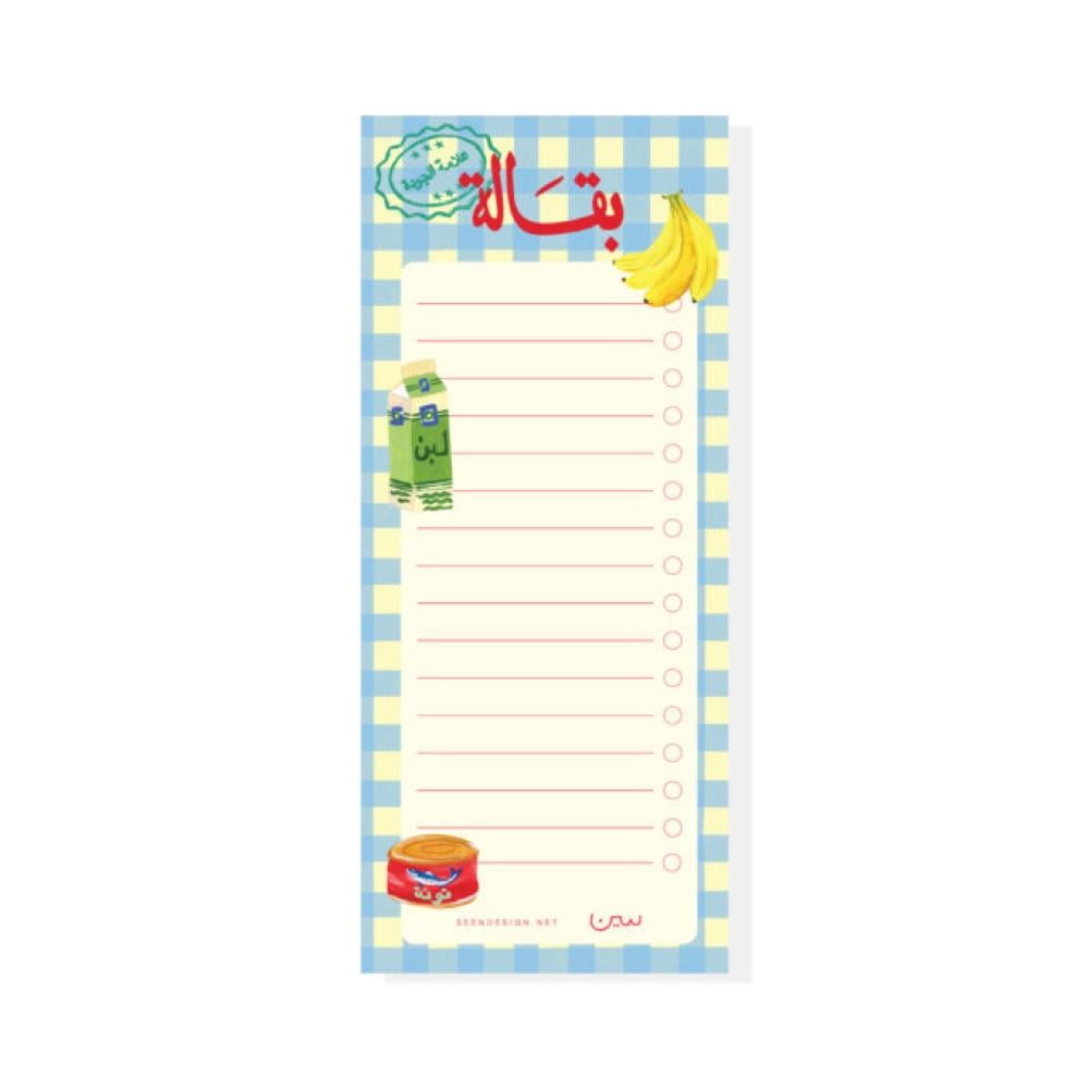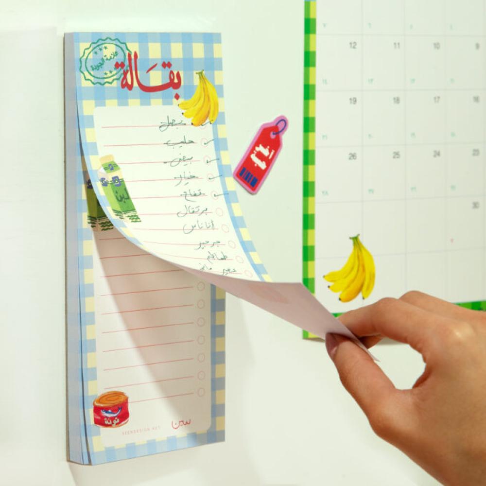 ظمي مشترياتك اليومية باستخدام قائمة المقاضي الرائعة، والتي تعتبر إضافة مهمة لأي مطبخ، حيث يمكن تعليقها بسهولة على الثلاجة بفضل المغناطيس المدمج. تتميز هذه القائمة بألوانها الجميلة والمزهرة. تحتوي على عبارة “بقالة” بخط عريق يضيف لمسة من التفرد، متزينّة برسومات جميلة تضفي طابعاً فنياً.