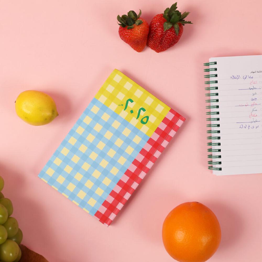 أجندة حجم صغير بنقشة كاروهات من مجموعة بقالة، بألوان تبعث البهجة وتصميم يعيد ذكريات الطفولة بين حصص التدبير ودكاكين الحي.