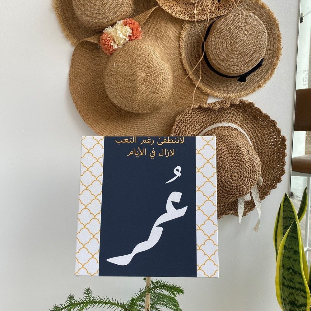 يتوسطها ورقة بلون متباين من الأخضر الملكي تحوي كلمة عمر بتشكيل وخط مميز يبرز جمال اللوحة ..